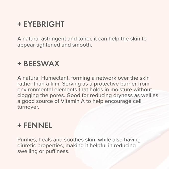 - KERY INGREDIENTS: Foeniculum Vulgare (Fennel) Fruit Extract, offers a treasure trove of vitamins, minerals, and potent antioxidants like Quercetin and Beta Carotene. Euphrasia Officinalis (Eyebright) Extract is a clinically endorsed botanical, specifically chosen for its remarkable ability to soothe the eye area. Renowned for reducing puffiness and diminishing dark circles. Natural anti-inflammatory with polyphenol antioxidants, Omega 3 and 6. Vitamin C and Tyrosinase inhibitors prevent pigmentation, brighten, and balance skin tone. Essential fatty acids promote a radiant complexion.
