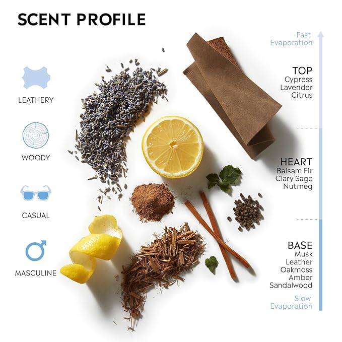 - Fragrance Notes: The top notes boast cypress, lavender, and citrus, the heart notes feature balsam fir, clary sage, and nutmeg, and the base notes exude musk, leather, oakmoss, amber, and sandalwood