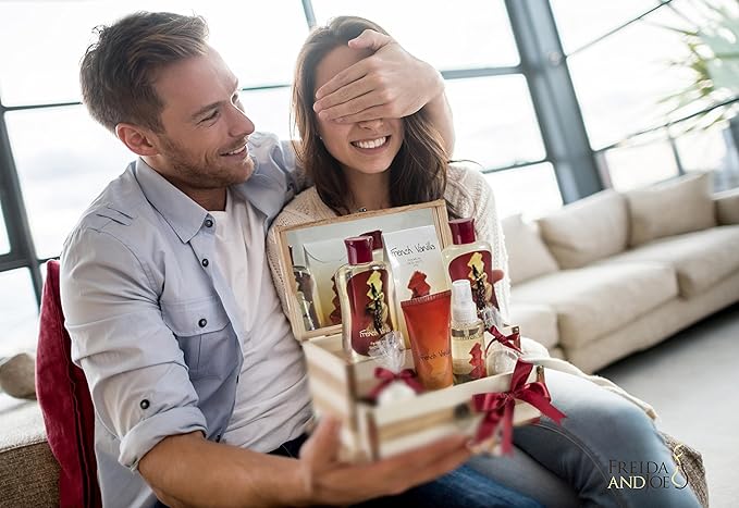 French Vanilla Bath Set Essential Bath and Body Basket: 2 Vanilla Bath Bombs, Body Lotion, Body Spray, Bath Salts, etc in a Wooden Jewelry Box Mother’s Day Gift for Mom