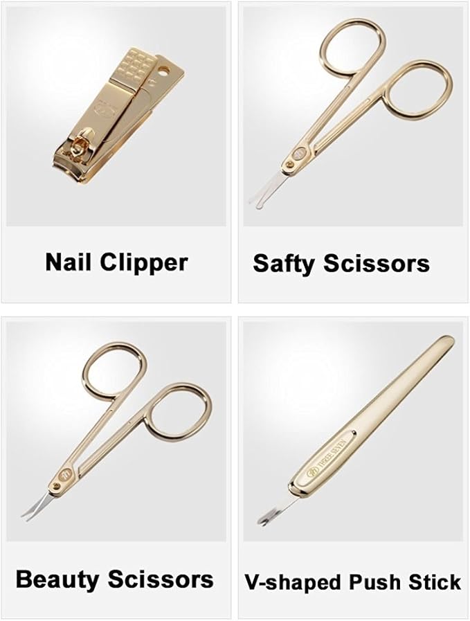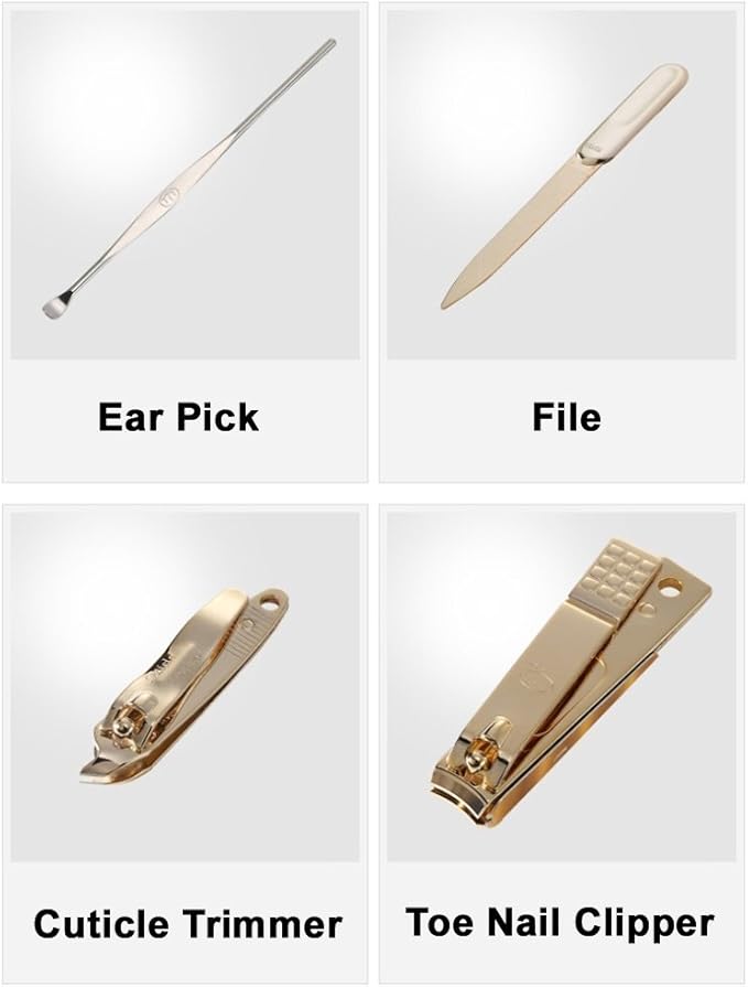 - Included (Total 10 Pcs: Nail Clipper, Toe Nail Clipper, Cuticle Trimmer, Tweezers, Beauty Scissors, Safety Scissors, File, Double-sided Push Stick, V-Shaped Push Stick, Ear pick: TS-2100BG)