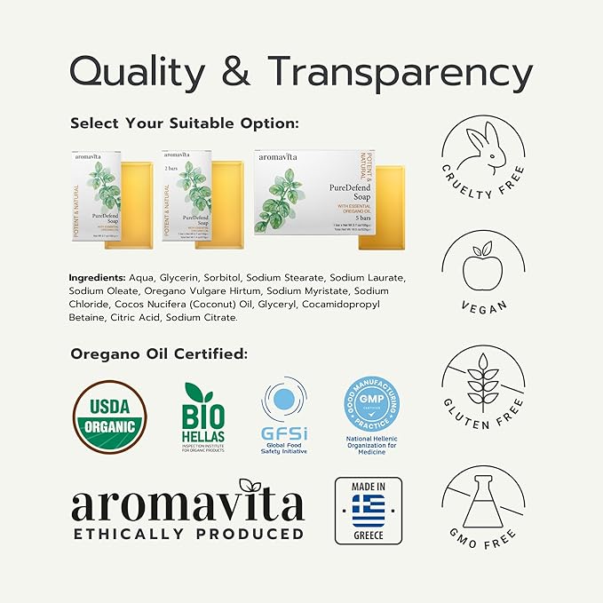 - NATURAL PROTECTION AND RELIEF – Aromavita Oil of Oregano Soap Bar is a powerful natural ally for your skin. Its high content of Greek Oregano Oil is known for its properties on the skin, as it helps destroy harmful microscopic entities that remain hidden and invisible to the human sight, and soothe irritated skin. Its natural glycerine also helps balance the natural skin moisture barrier.
