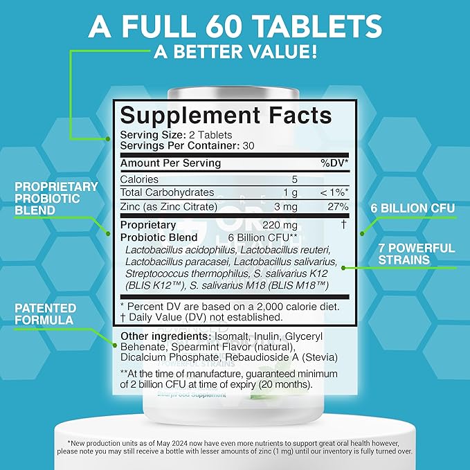 - Clinically Researched Strains — A powerful blend of dental probiotics packed with 7 potent strains of probiotics: the patented BLIS K12 and BLIS M18, Lactobacillus Acidophilus, Lactobacillus Reuteri, Lactobacillus Salivarius, Lactobacillus Paracasei, Lactobacillus Thermophilus, and Streptococcus Salivarius.