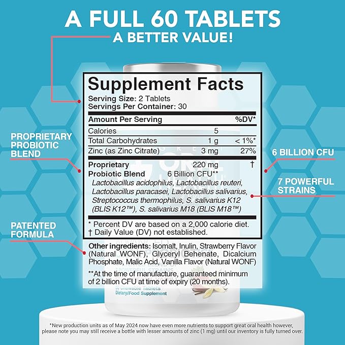 - Clinically Researched Strains — A powerful blend of dental probiotics packed with 7 potent strains of probiotics: the patented BLIS K12 and BLIS M18, Lactobacillus Acidophilus, Lactobacillus Reuteri, Lactobacillus Salivarius, Lactobacillus Paracasei, Lactobacillus Thermophilus, and Streptococcus Salivarius.