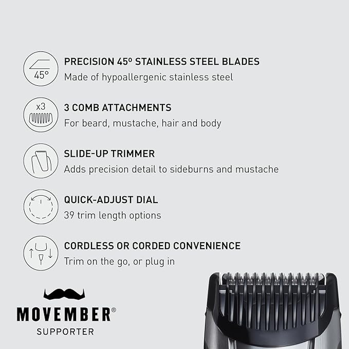 - Edge and Detail: A slide-up precision trimmer adds the perfect detail to beards, mustaches and sideburns