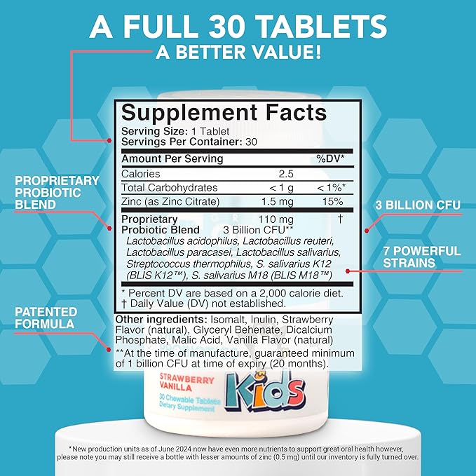 Oral Probiotics for Mouth Bad Breath Treatment for Kids Dental Care & Cavity Prevention with BLIS K12 M18 β Dr Formulated Dental Probiotics for Teeth and Gums, 30 Chewable Tablets Strawberry Vanilla