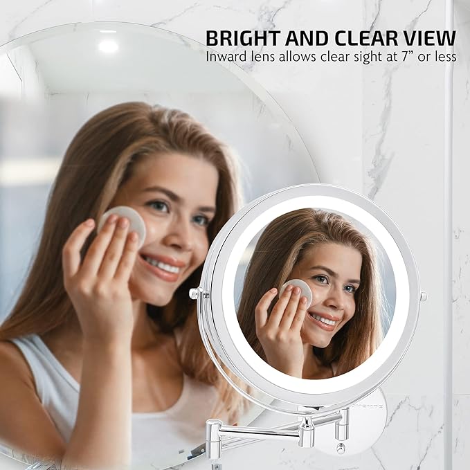 - EXTENDABLE ARM WITH 360° ROTATING FUNCTION – The adjustable arm extends up to 13 inches from the wall, while the smooth rotation mechanism enhances convenience and efficiency, letting you adjust the mirror effortlessly to meet your needs. With a generous 9-inch diameter, it provides ample viewing space for flawless hair styling, makeup application, and skincare routines.