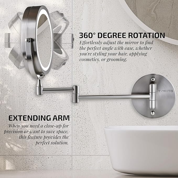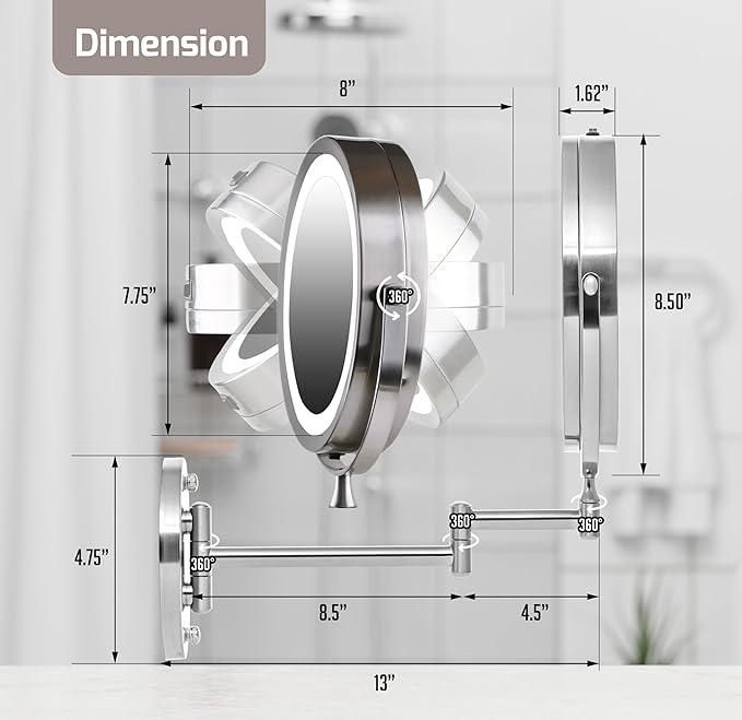 - EXTENDABLE ARM WITH 360° ROTATING FUNCTION – The adjustable arm extends up to 13 inches from the wall, while the smooth rotation mechanism enhances convenience and efficiency, letting you adjust the mirror effortlessly to meet your needs. With a generous 7-inch diameter, it provides ample viewing space for flawless hair styling, makeup application, and skincare routines.