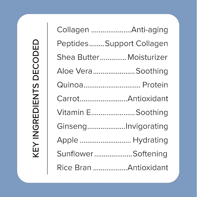 - NOURISHING + HYDRATING – With age our skin loses elasticity & moisture, our Clinically-Tested, Dermatologist-Tested, & Allergy-Tested hydrating Collagen + Peptides formula visibly smooths the look of skin's rough texture, plumps overall skin tone, & replenishes essential moisture to visibly restore volume to areas prone to sagging, dark spots, & wrinkles. Nourish, hydrate, & plump your skin for a healthier, fuller, & younger appearance while also improving your skins elasticity all at once.