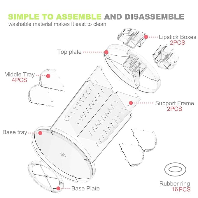 - [STURDY & DURABLE]---Made of premium thick acrylic, making our makeup stand organizer clearer and more sturdy than others. 20 High quality rubber rings (16 rings required, extra 4 rings spare) can keep all trays secured. Easy to be assembled and disassembled according to the User Manual.