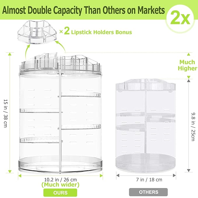 - [EXTRA LARGE CAPACITY]---360 degree make up organizer can hold at least 60pcs cosmetics and skin care products together, save up 50% space. Overall Size: 10.2x10.2x15 inch.