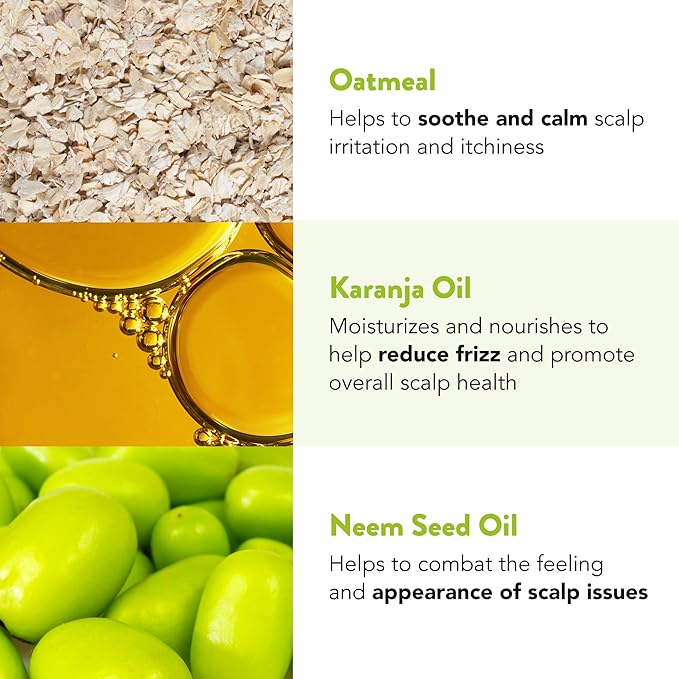 - Nourishing Ingredients: A powerful blend of neem and karanja oils, renowned for their healing properties in Ayurvedic medicine, soothing oatmeal to calm dry scalps, cocoa butter, and coconut oil, all provide softness and shine to your hair.