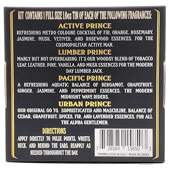 Premium Prince Solid Cologne 1 oz Variety Gift Set Alcohol Free Natural Concentrated Full Size Travel Friendly Tins Men's Fragrance 4 Manly Scents to Satisfy all Types of Viking Cannon Black Prime