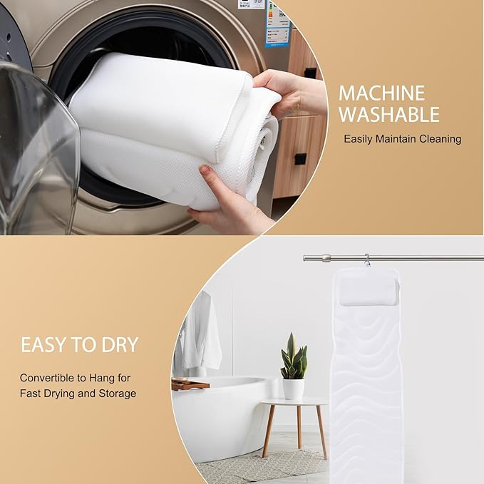 - Easy to Use and Clean: Featuring a built-in hanging hook, our bathtub pillow is not only easy to use but also effortless to store. Simply pop it in the washing machine! The quilted layers are soft, comfortable, and prevent water from pooling, ensuring the pillow stays fresh and clean for each use