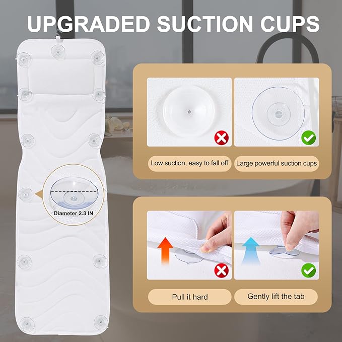 - Perfect for Any Bath Tub: Our full body bath pillow is universal and easy to fix, as it fits any tub - soaking, straight back, freestanding, and more. Indulge in a relaxing spa experience and feel the difference with our bathtub cushion. An ideal choice for anyone who loves bathing
