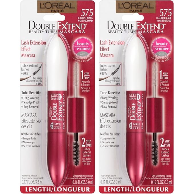 L'Oreal Paris Makeup Double Extend Tubing Mascara, Lengthening 2 Step Mascara, Smudgeproof, Blackest Black, Pack of 2