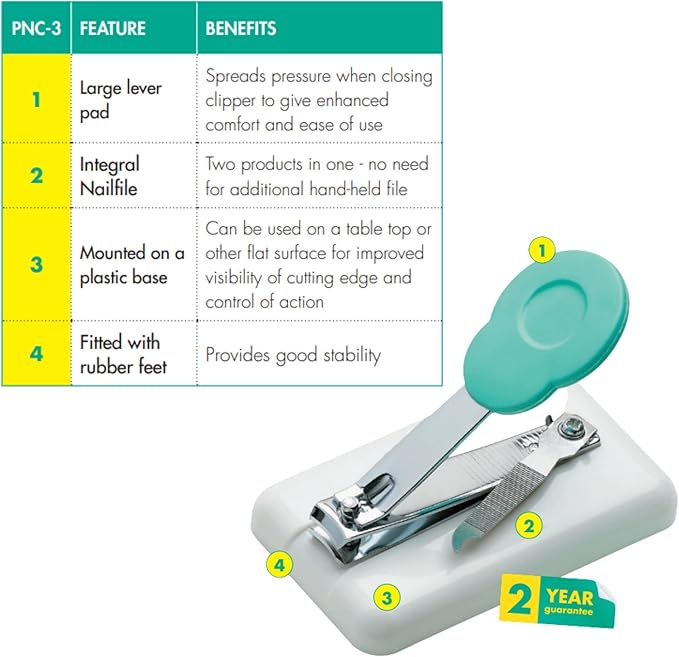 Peta Table Nail Clipper PNC-3 - Mounted and Non-Slip - Plastic Base with Rubber Feet - for Anyone with Poor Hand Control, Weak Hand Strength and Tremors