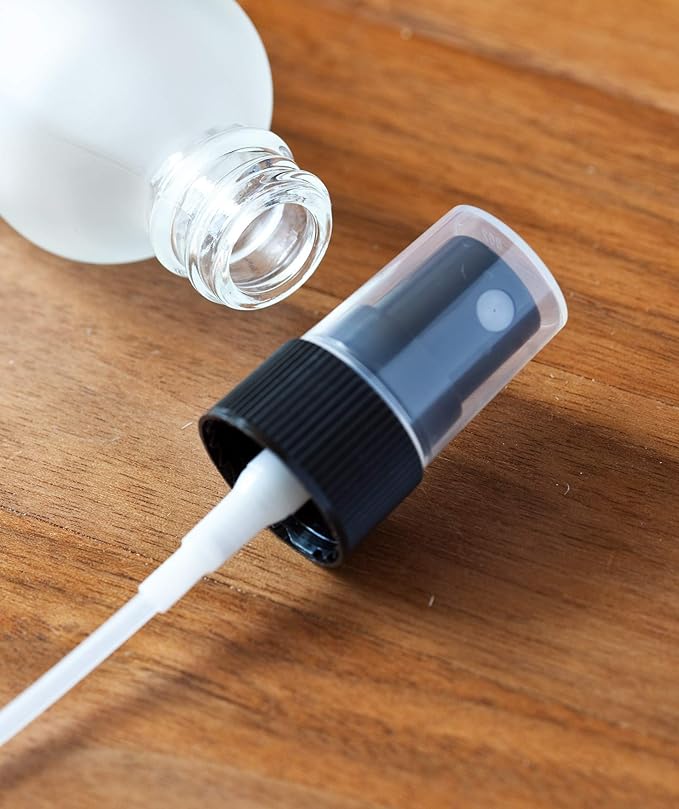 JUVITUS 2 oz Frosted Clear Glass Boston Round Bottle with Black Mist Spray (12 Pack) for Cosmetics, serums, Carrier and Essential Oils, Aromatherapy