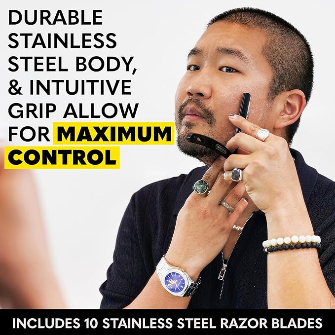 - STRAIGHT EDGE RAZOR & LEATHER CASE - Perfectly balanced and weighted for superior control allowing for personalized barber like detailing. Swing lock blade insert provides for a easy blade replacement while keeping blades firmly in place. 10 stainless steel razors included to maximize sharpness and durability