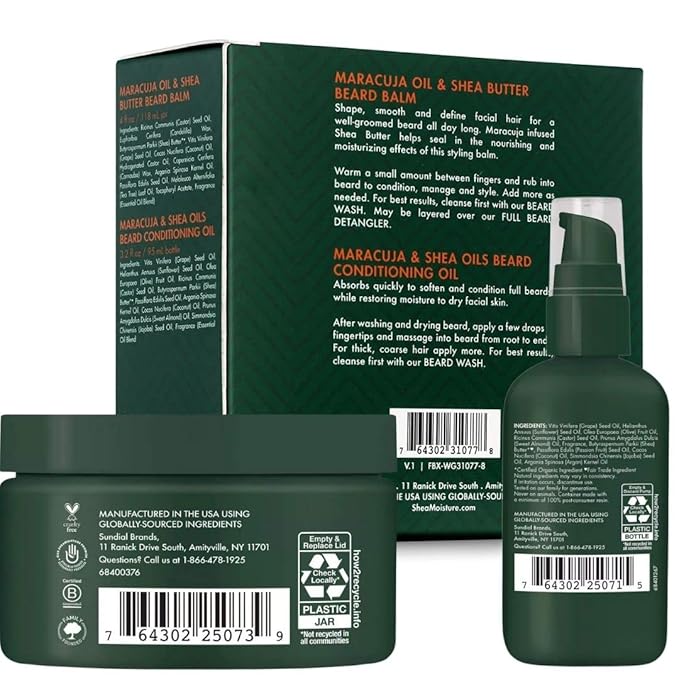 - DEFINE STYLE MOISTURIZE BEARDS.: Infused with shea butter, this 2-piece beard grooming Set will Shape, smooth and define facial hair for a well-groomed beard all day long. Maracuja infused Shea Butter helps seal in the nourishing and moisturizing effects of this styling balm and beard Oil.