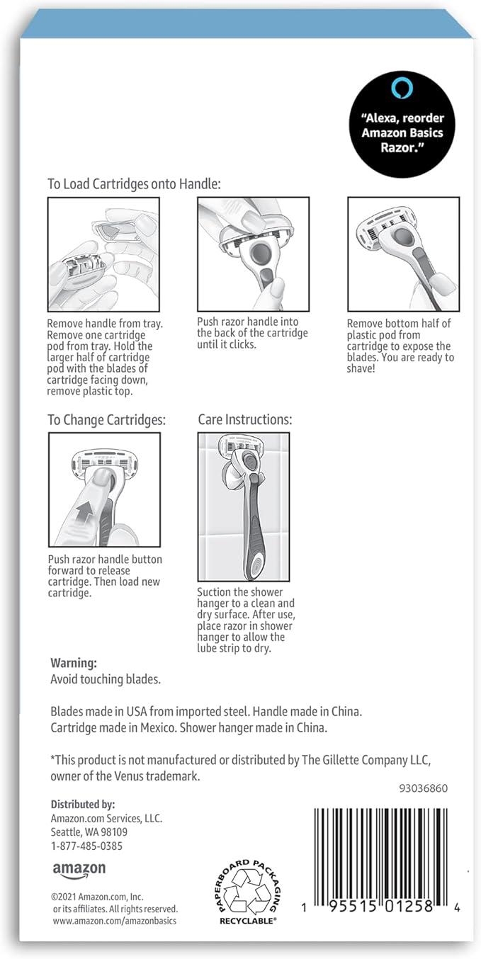 - Alexa voice shopping enabled: to place your next order, just say, “Alexa, reorder Amazon Basics Razor.”