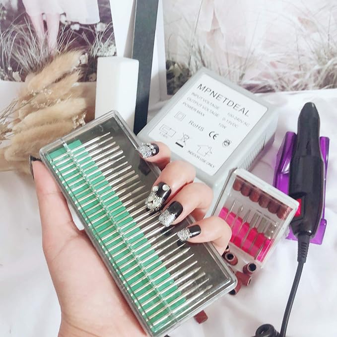 - 【ITEM INCLUDED】: 1x Electric Nail Drill Machine,1xHand Piece, 1x Cradle for holding the hand piece,2 boxes of Drill Bits(36pcs), 56 pcs of sanding bands,10 x nail buffer file, 2 x White buffer Block, 1 x Instruction.