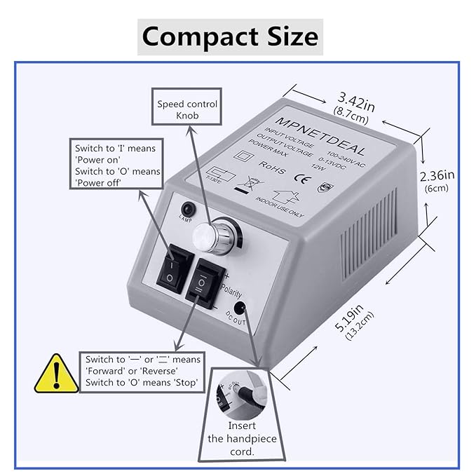 - 【Adjustable Speed and Easy to use】: With a speed control Knob, which makes this electric nail file easier and safer to polish your nails. It is professional for both home and salon use.This electro file is with a powerful yet quiet motor. Also, the smart heat dissipation can avoid overheating efficiently. The speed can be adjusted from 0-20,000RPM.