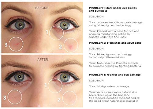 - TRIPLE-PIGMENT TECHNOLOGY: Triple-pigment technology diffuses the look of dark circles, redness, breakouts, and sun spots without ever looking cakey.