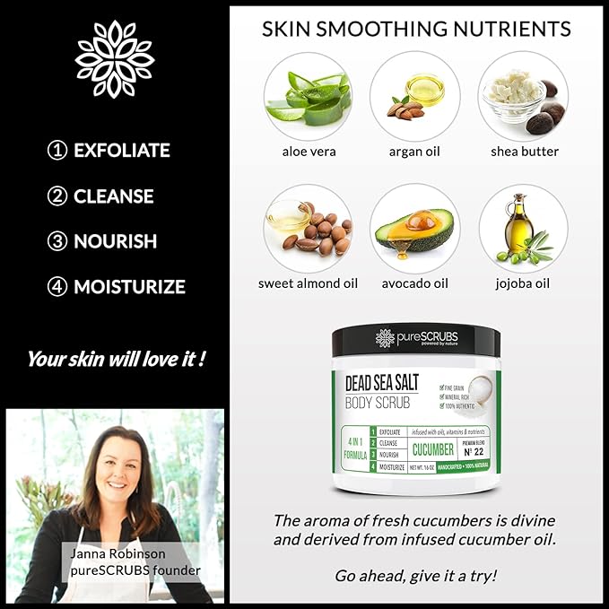 - GET ULTRA SMOOTH SKIN FAST - THIS WORKS! Our unique “4 in 1 Formula” does everything a body scrub should do and more - EXFOLIATE, CLEANSE, NOURISH & MOISTURIZE. Fine grain dead sea salt infused with essential oils, nutrients and skin softeners helps to smooth away rough, bumpy, and uneven textures to instantly reveal your true soft, healthy and radiant skin. You'll love the cucumber aroma!