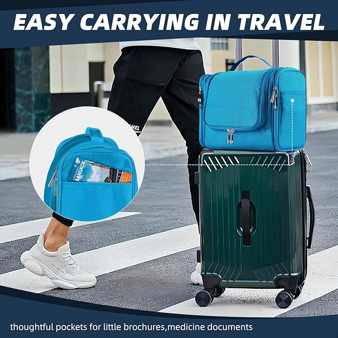 - Multiple Pockets and Compartments: The toiletry bag has more pockets and compartments than you might expect! It features 2 top mesh pockets ideal for small items like medicine and wet wipes. There is also a large main storage pocket for travel-size and normal-size toiletries, with internal compartments designed to keep liquid bottles upright. Additionally, the 2 side pockets are perfect for long, slim items such as makeup brushes, toothpaste, toothbrushes, and more