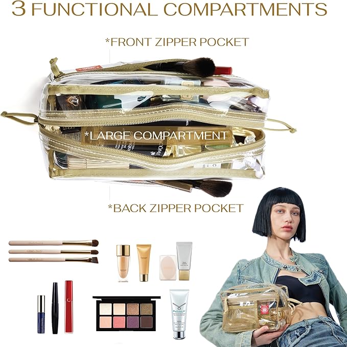 - Spacious & Organized: Measuring 9.5 x 2.75 x 6 inches, the clear makeup bag features a main divider pocket, front zipper compartment with an internal mesh pocket for travel size toiletries kit and makeup, and a magic tape back pocket for quick access