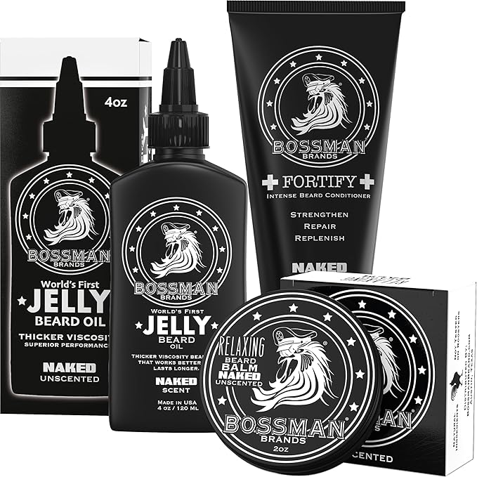 - Your 3-Piece Essentials Beard Treatment Package: Our beard care kit includes the Fortify Intense Beard Conditioner, Jelly Beard Oil and Relaxing Beard Balm. The combo of these three Bossman beard products is designed to moisturize hair and skin, promote strength, and train unruly beards. It also makes a fantastic gift set for the bearded bosses in your life.