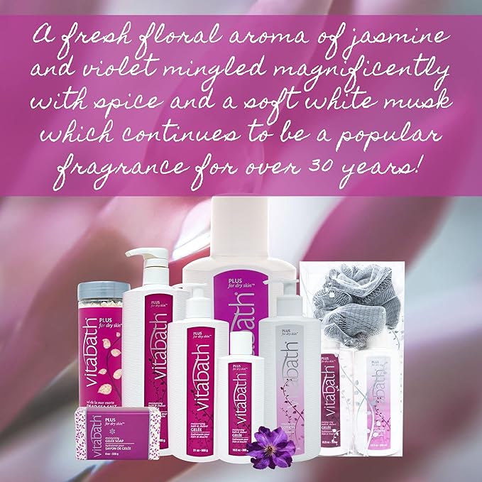 - LUXURY SKIN INDULGENCE - Beautiful floral scent with soft jasmine, violet mingling marvelously with spice and white musk melts into skin while vitamin A, E, and C, rich emollients shea and aloe vera nurture, leaving very dry skin soothed, smelling lovely and touchably soft.