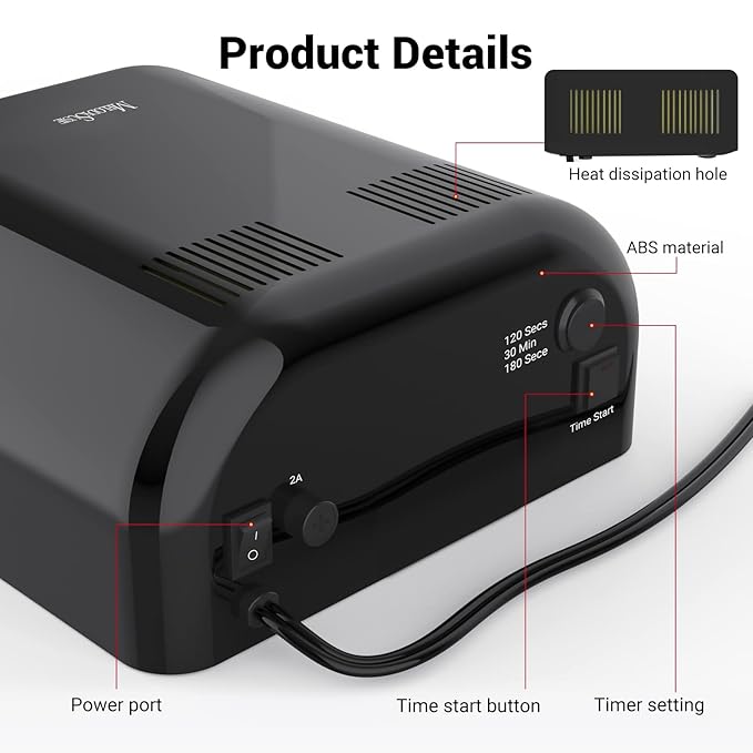 - 3 Timer Setting & Sliding Tray: 120s/180s/30min timer setting to meet your different curing requirements well and make you control the curing time easily. The sliding tray ensure you can cure your resin, 3D prints, toenail gel polishes perfectly and clean the nail lamp easily.