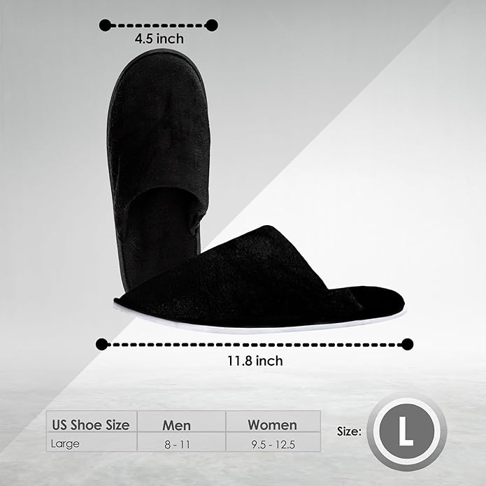 - SIZING: Each pack contains 6 pairs of large closed toe spa slippers (black upper, white sole). The large size measures 30cm/11.8" in length. Large Size = Men's 8 ~ 11 (Width D) / Women's 9.5 ~ 12.5 (Width D) . Each pair comes with a high quality drawstring bag (6 bags total) so your slippers can be kept stain free