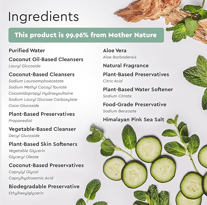 - Cucumber & Mint: A gentle aroma of real muddled cucumber with refreshing zests of mint sprigs will heighten your hand washing experience and quickly disappear after rinsing
