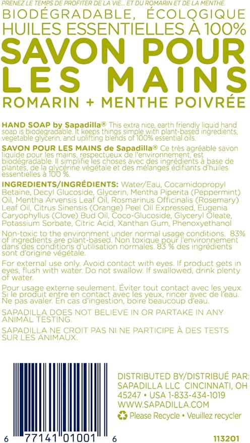 Sapadilla Liquid Hand Soap - Rosemary + Peppermint - Made with 100% Pure Essential Oil Blends, Cleansing & Moisturizing, Aromatic & Fragrant Hand Soap, Plant Based, Biodegradable, 12 Ounce (Pack of 1)
