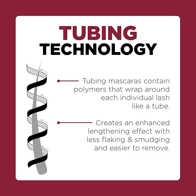 - L'Oreal Tubing Technology: Tubing mascaras contain polymers that wrap around each individual lash like a tube that creates an enhanced lengthening effect with less flaking and smudging and easier to remove.