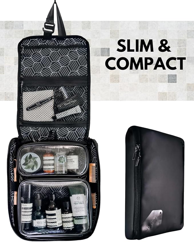 Flat Toiletry Bag for Travel. Slim Dopp Kit Organizer for Men. Hanging Mens Shaving Case with Detachable Pouches. TSA Approved. Size 11.02 x 8.46 x 1.57 inches (28 x 21.5 x 4 cm)
