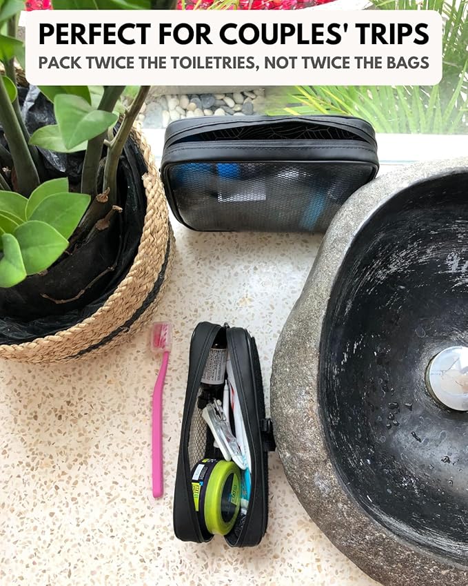 - TSA APPROVED – Our design features a durable construction with a transparent front made of PVC and mesh reinforcement. This ensures quick and hassle-free passage through airport checkpoints, while also complying with airline regulations for carrying toiletries for men and women. You can breeze through security checks with ease and have peace of mind knowing that your essentials are in compliance with travel requirements.