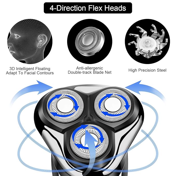 - SMOOTH & QUICK SHAVE: The 3D floating heads with precision blades of upgraded double-blade technique automatically adapts to the contours of the face, neck and even the jaw. Rounded edges move smoothly over skin for a protective shave