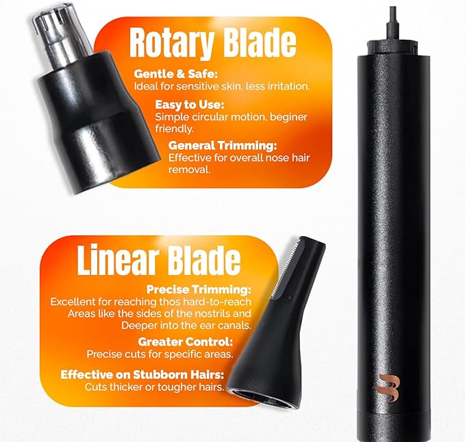 - Comfortable and Safe: The sleek design of our nose hair trimmer and ear hair trimmer for men fits comfortably into ears and noses, ensuring a painless and efficient trimming experience. No more worries about scissors and open blades in sensitive areas with our nose trimmer for men.