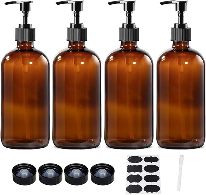 - Package:4 pack 16 oz Amber Glass Bottles with Pumps (The pumps has been upgraded to make it easier to press out the lotion), 4 caps, 8 chalk label, 1 pen