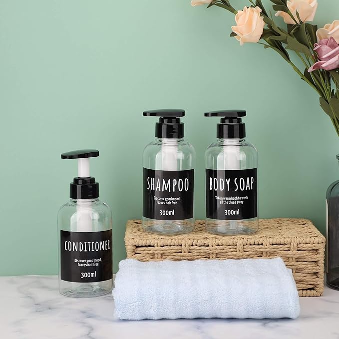 - 【Simple Look】 Its elegant look can update your bathroom. Set of 3 packs dispenser bottle, each holds 10.1oz large capacity to meet the whole family's essential needs. 3 pre-labeled waterproof label bottles, shampoo, body soap and conditioner, enable you to identify your bottle. It could clean up the shower look and help organize your bathroom essentials.