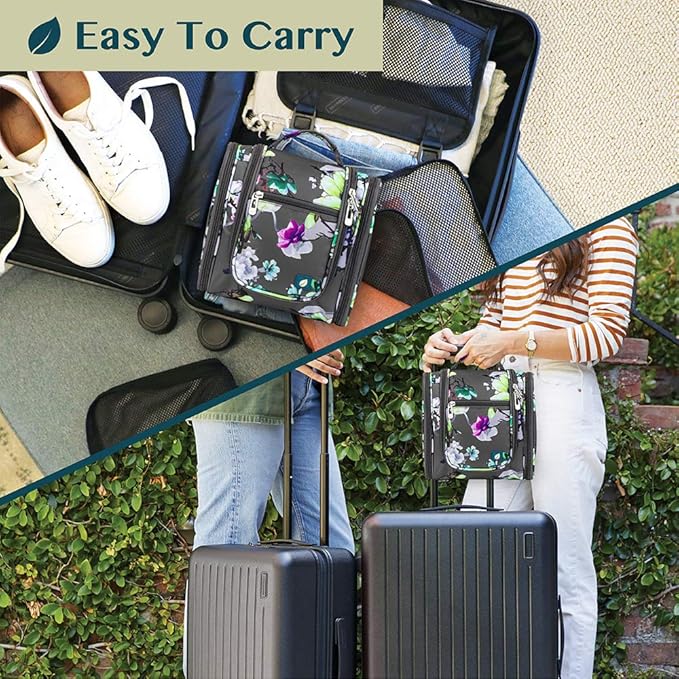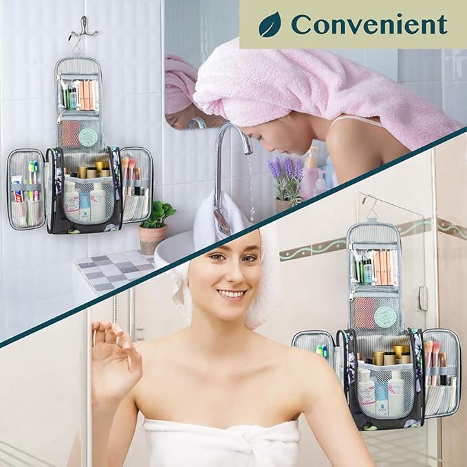 - COSMETICS TRAVEL BAG ORGANIZER: This toiletry bag for women has a hanging hook and multiple pockets that help you stay organizer during business trip, vacation travel. The hanging hook makes it easy to hang the toiletry bag to bars in the hotel shower bathroom. Unzip your toiletry bag to reveal compartments to organize your shampoo, skincare face hygiene products. This toiletry travel bag is an essential accessory for cruise in Europe, plane, Hawaii Trip, and honeymoon.
