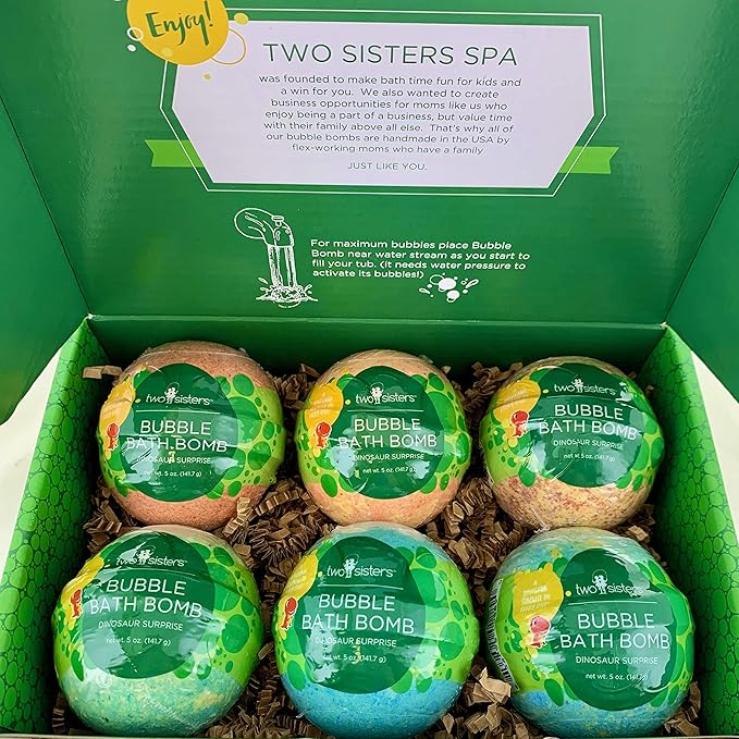 Dinosaur Bath Bombs for Kids with Surprise Dino Toys Inside (6 Pack) - Large Bubble Bath Bombs, Gentle and Safe, Made in USA, Gift Ideas for Boys, Girls and Teens by Two Sisters
