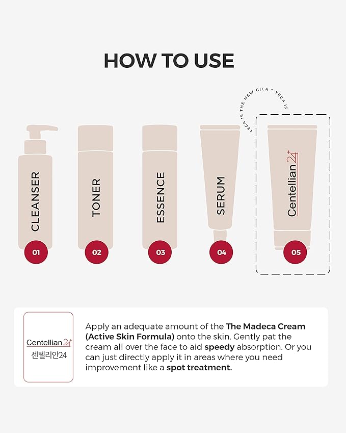 - CENTELLIAN 24 MADECA CREAM (SEASON 5, 50ml/1.7fl oz) - TECA (titrated extract of centella asiatica) and centella asiatica, coupled with hyaluronic acid, collagen, elastin, ceramide, and phospholipids help soothe and calm sensitive skin.