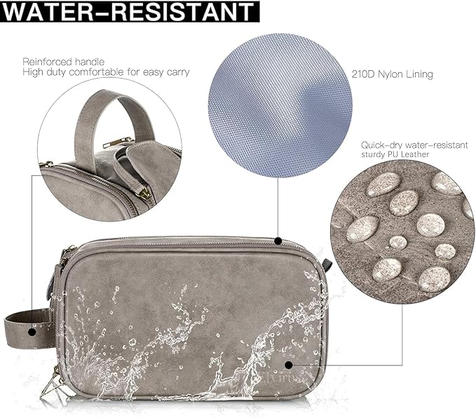 - WATER RESISTANCE STURDY MATERIAL: Exceptionally well built, the toiletry bag is made of PU leather, water-resistant nylon lining to keep moisture out of the bag. Premium zipper and reinforced seams are also implemented for long-lasting performance