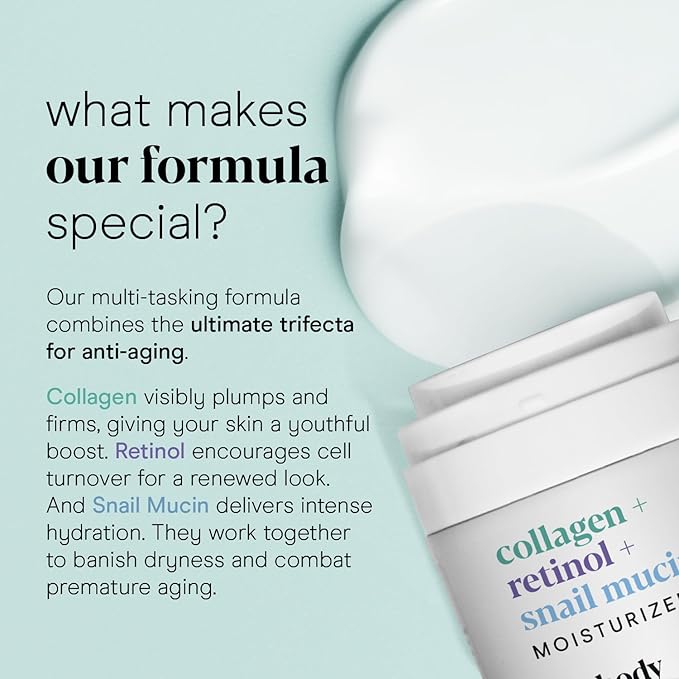 - LOOK & FEEL FOREVER YOUNG: With the power trio of anti-aging ingredients (collagen, retinol, and snail mucin), this face moisturizer for women & men softens visible wrinkles while keeping skin looking plump and firm. Your youthful glow begins here