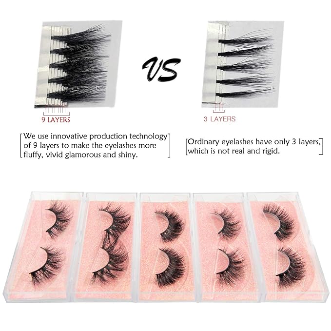 GOO GOO Mink Eyelashes, Natural Daily Type 3D Mink Lashes 16mm-20mm 5 Styles Multipack Perfect Layered Effect Hand Made Strips Siberian Fake Eyelashes Fluffy Full False Eyelashes