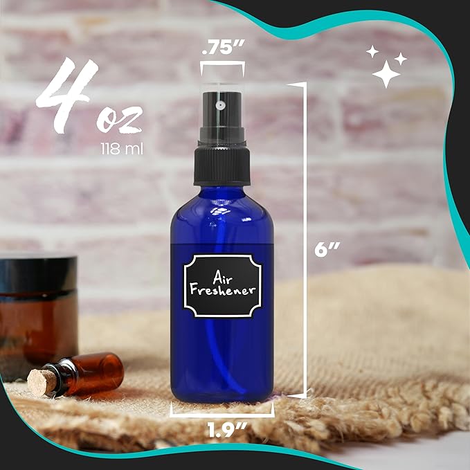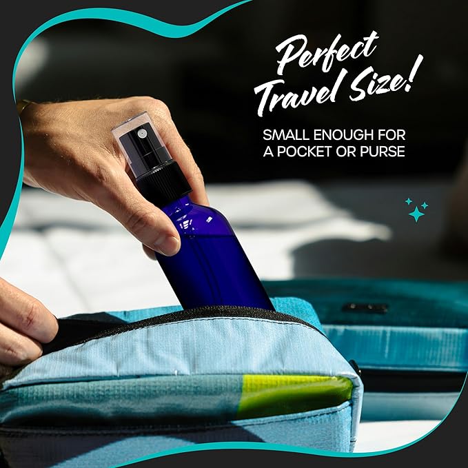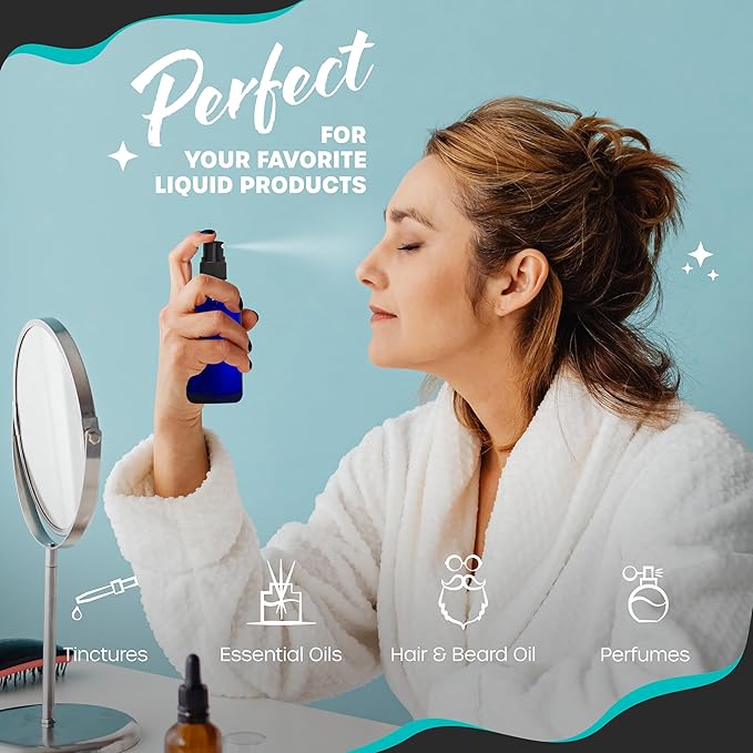- Premium Small Spray Bottles 4 Oz Set: Our fine mist spray bottles are a great addition to your daily routine! Thick glass construction mean each small glass spray bottle is built to last. The cobalt blue spray bottle glass not only looks gorgeous but also safeguards contents from UV rays. With precise nozzles, secure seals & a clog-resistant design, our 4 oz spray bottle offers flawless refreshment every time. A sturdy, convenient, & consistent fine mist spray bottle for hair , face, & body!